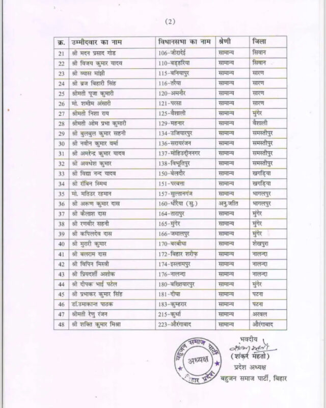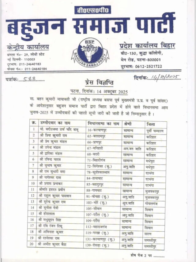 पटना। बसपा सुप्रीमो मायावती बियफे के बिहार विधानसभा चुनाव खातिर 88 प्रत्याशियन के सूची जारी कs देले बा। ऊ प्रचार खातिर 40 स्टार प्रचारकन के सूची जारी कइले बा।
